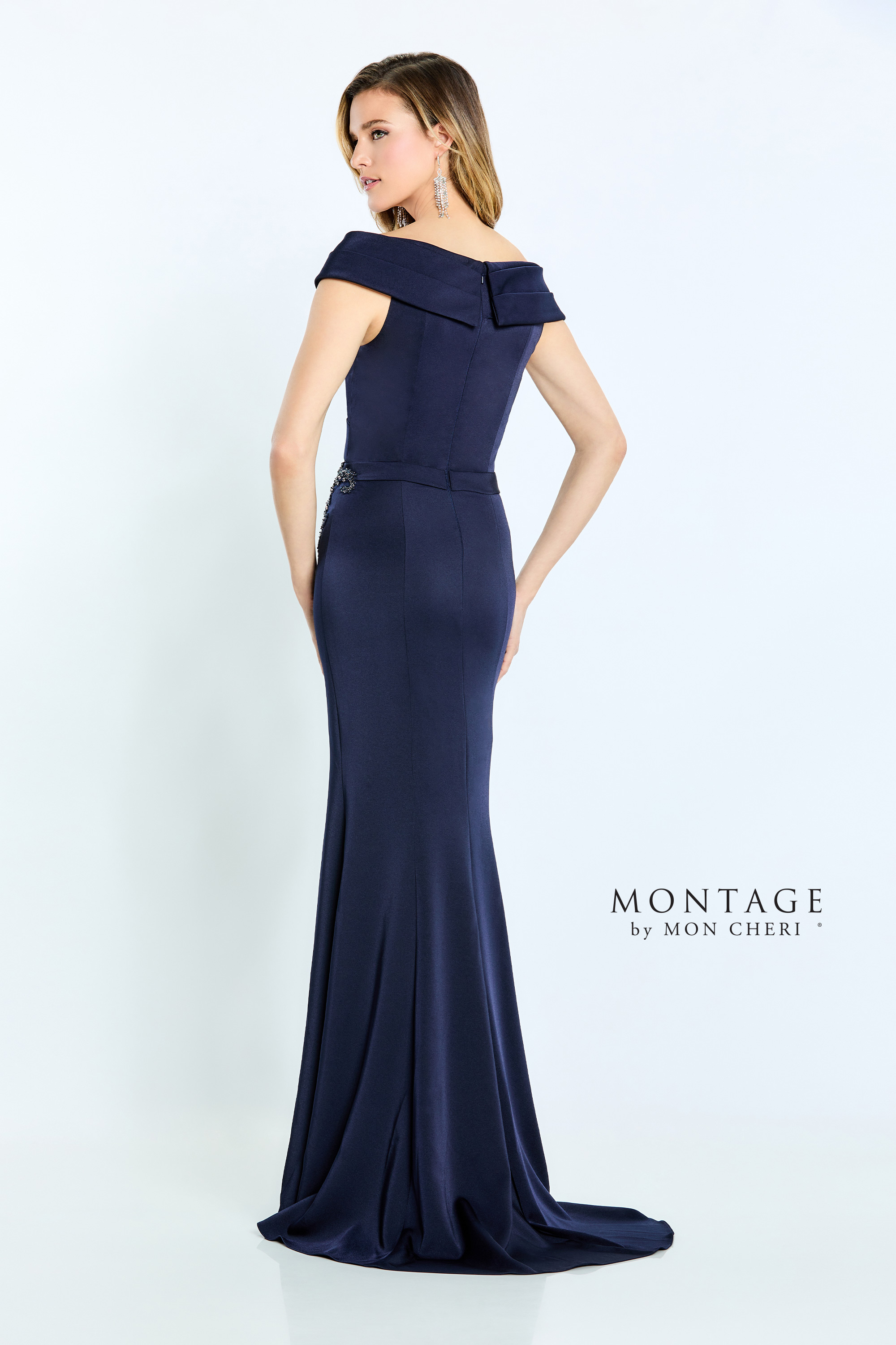 A sheath stretch crepe gown with a v-neckline, tip-the-shoulder sleeves, a beaded waist, and a sweep train.