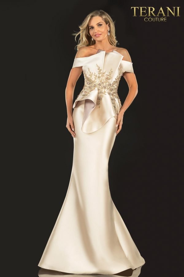 Unique sculptured bodice enhanced with beaded lace applique detail, off shoulder with slim skirt.
